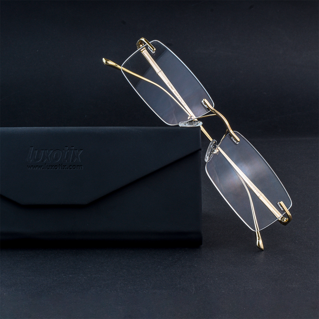 In the box: Stylish Golden Rimless Eyeglasses OLD1922M C2, Luxurious Protective Box, Wiper